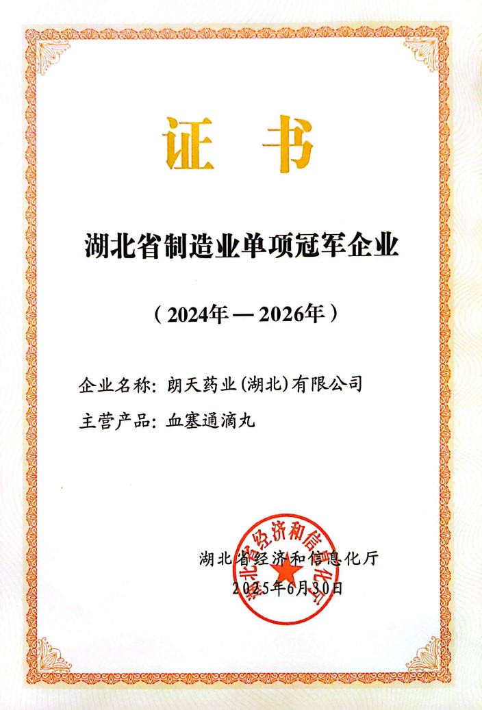 近日,由湖北省经济与信息化厅主办的2025年全省制造业优质企业与基金供需对接暨制造业单项冠军企业培育活动在咸宁举办。朗天药业(湖北)有限公司被授予“湖北省制造业单项冠军企业(血塞通滴丸)”。